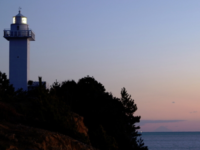 全国的にもめずらしい四角い白亜の灯台。映画「喜びも悲しみも幾歳月」の舞台になった。灯台は昭和23年に建設。参観可能で、波静かな的矢湾と荒々しい太平洋の対照的な波の様子を見ることができます。天気がよいと富士山が見える。周辺は芝生広場となっている。